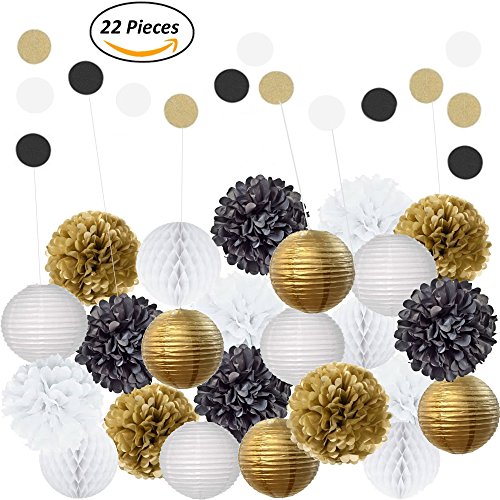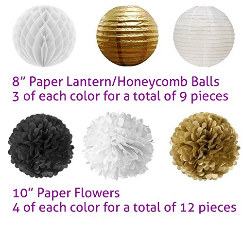 Amazing 22Pcs Mixed Black Gold & White Party Decorations By Epique Occasions: Set of Hanging Tissue Paper Pom Poms, Lanterns & Balls For Birthday...