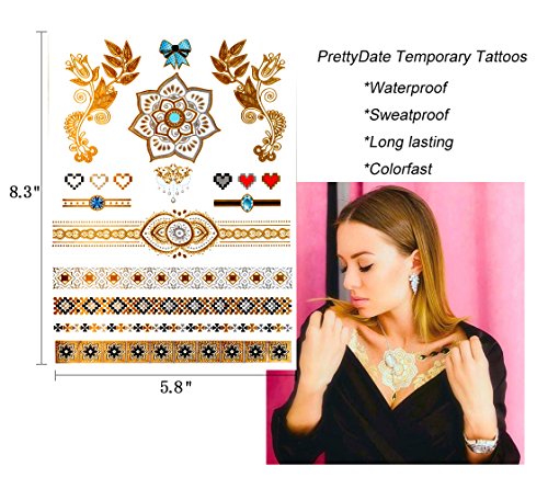Metallic Temporary Tattoos, PrettyDate 6 Sheets 75+ Designs in Gold Silver Black Sapphire, Fake Glitter Jewelry Tattoos- Bracelets, Necklaces, Wrist,...