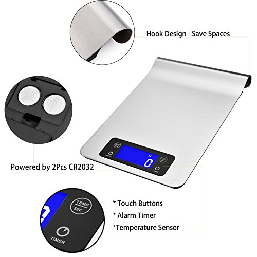 Food Scale with Back Light Display and Touch Buttons: LCD display for clear readout in g, ml,lb:oz,fl.oz. Smart Calobration and will be off automatically in 60 seconds.