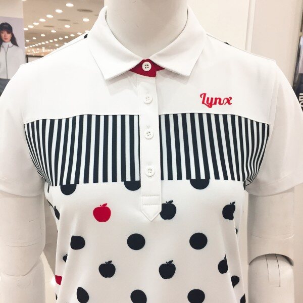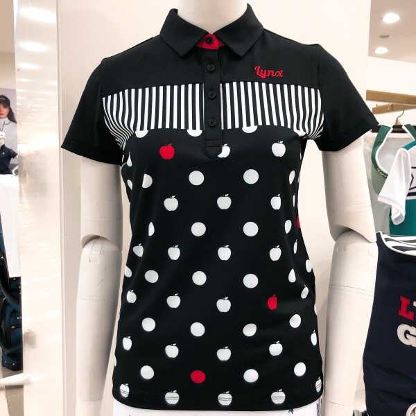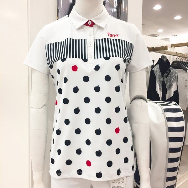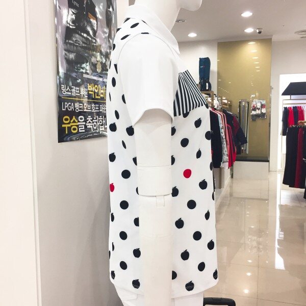 귀엽고 경쾌한 사과 패턴과 스트라이프 프린트가 믹스되어 여성스러운 디자인의 폴리 티셔츠 입니다