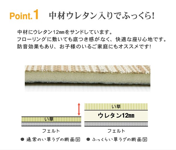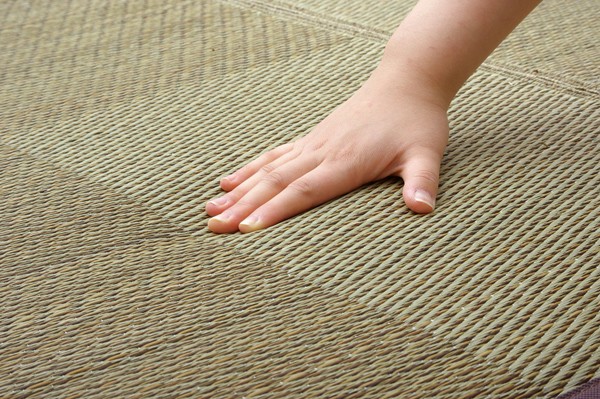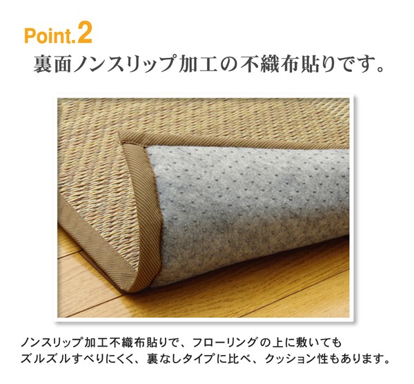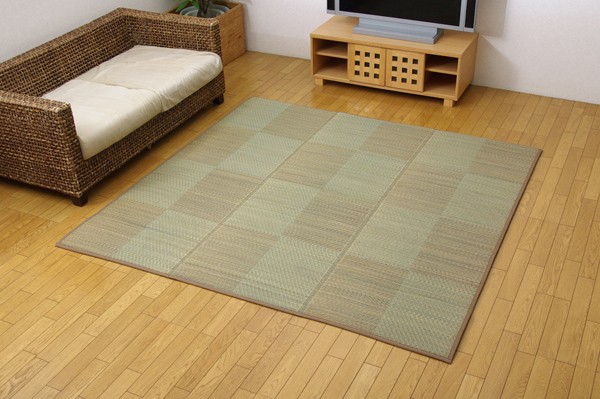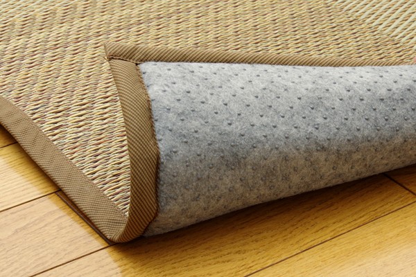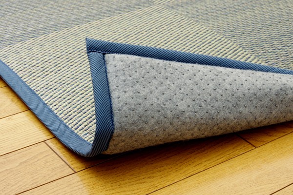 格子柄のい草ラグカーペットです。洋室でも和室でも合いやすいようにシンプルなデザインに仕上げました。裏地には床を傷つけにくい不織布を使用し、滑り止め加工を施すことにより、フローリングでもご使用しやすい商品です。