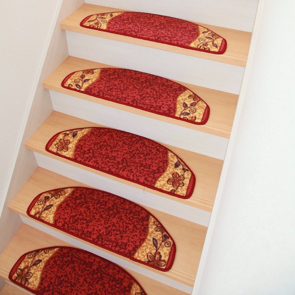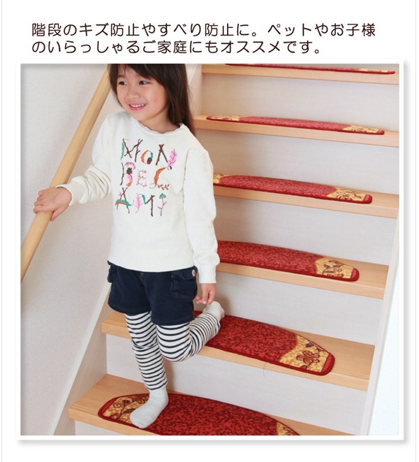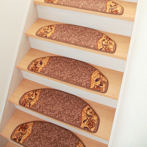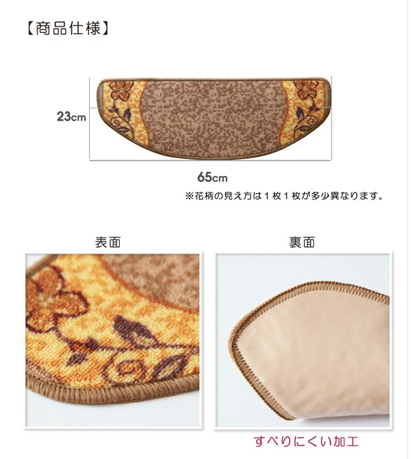 上品な花を描いた階段マットです。丈夫で汚れにくいナイロンを使用しています。15枚入りです。ペットの滑り防止や爪による床の傷防止としてもご使用いただけます。裏面にはすべりにくい加工を施しています。