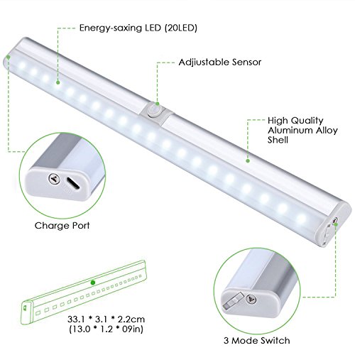 【3 MODES & RECHARGEABLE】: Always On, AUTO and Off, 3 working modes motion sensor closet light meet your different needs. Built-in 900mAh rechargeable lithium battery, after fully charge, can last for about 5 hours (Always On Mode) and 1-2 months (Auto Mode--activate 10 times a day). Simply recharge this closet light with included USB cable or any standard USB charger, no need to replace AAA batteries frequently.