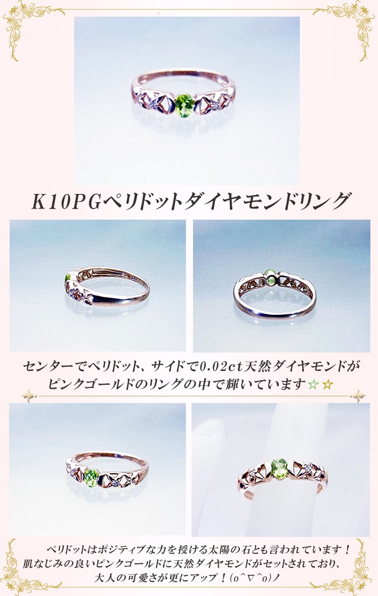 商品説明 ペリドットの石が輝いています。素材はピンクゴールドで、サイドの石はダイヤモンドです。