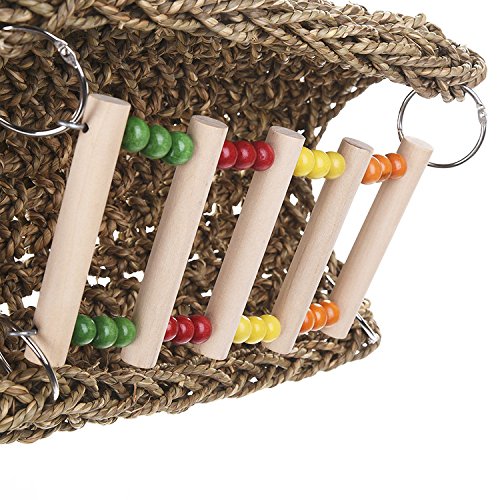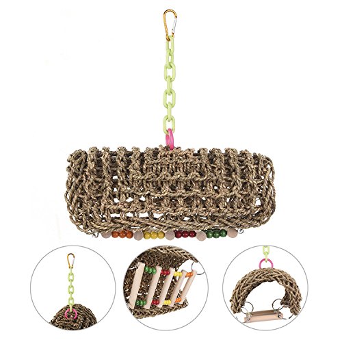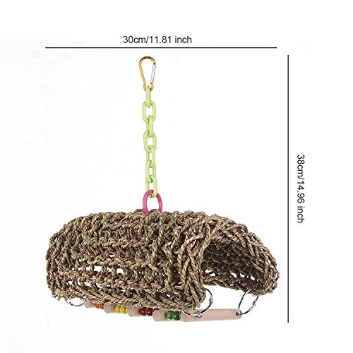 Features: Natural straw plaited funny swing with ladders, can be hung for decoration of bird cage, also can be bitten or climbed, to strengthen the balance and coordination skills. Role: to ease the pressure and boredom, suitable for the pet to climb and bite, is conducive to the physical health of birds. Parameter: Material: grass / plastic Color: As picture Size(approx.): length x width of mouth x height of mouth x overall height: 30 x 20 x 10 x 38cm /11.81 x 7.87 x 3.94 x 14.96 inch Note: There may be 1-3cm error due to manual measurement, the color of the accessories will be sent randomly. Packing List: 1 x Parrot Perch Toy 0