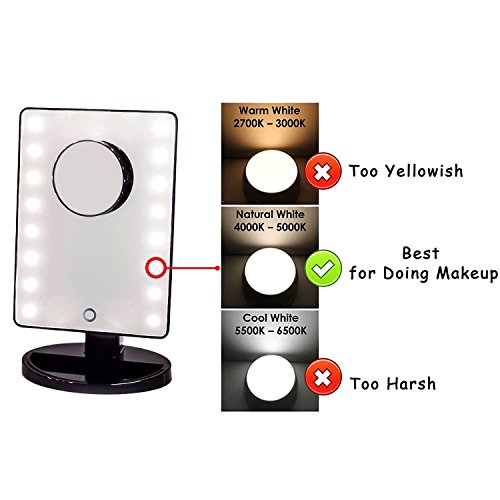 - 16 Pieces led light:Our makeup mirror is built-in 16 pieces distributed on both sides of the mirror,single power small,softer,not thorn eyes,surrounded by the distribution of all-round fill light adjustable Led lighted brightness,allow you makeup in the dark or poorly lit areas.