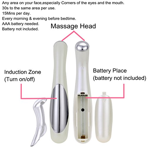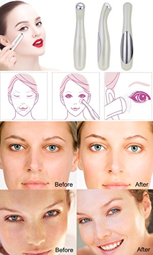 -. Feature : 1.No More Dark Circles: Say goodbye to dark circles beneath your eyes as eye massager helps to deeply penetrate eye cream serum or cream in dermal layers. It is designed to treat every major eye concern, dark circles, puffiness, and wrinkles. / 2.Enjoy Being Young: The relaxing massage when combined with eye serum gives you a younger looking skin. It reduce appearance of fine lines around the eyes. It can be used as an all-over face treatment for a brighter more radiant complexion. / 3.This cool and refreshing light serum is immediately absorbed by your skin much deeper without leaving a greasy or sticky feel. / 4.Roll On Massager: PORTABLE & LIGHTWEIGHT fits in purse, cosmetic bag. Can also be used on forehead, around lips & brow areas. Massage your eyes and the delicate areas surrounding your eyes with the roll on applicator. Gently roll the skin renew anti-puff eye roller under the eye, from inner corner to outer corner, one to two times. Use your finger to smooth in any excess until absorbed. / 5.SONIC INFUSION SYSTEM: Uses Ultrasonic Therapy and Negative-Ion, Micro Electric Pulses to gently ' push' treatments deeper where they can be far effective. This results in noticeable reduction in the appearance of wrinkles & fine lines under eyes & around mouth. 6.ASSISTS IN THE ABSORPTION OF EYE COSMETIC TREATMENTS giving noticeably firmer skin in 2-3 weeks.