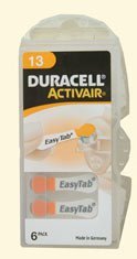 -. Feature : Duracell Activair Hearing Aid Batteries. / Size 13 batteries. / Six batteries per order. / Batteries with tabs for easy insertion.