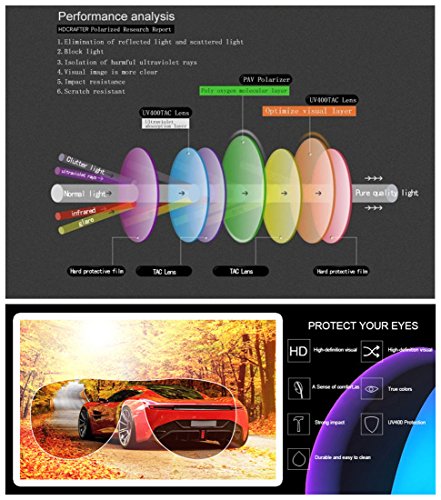 •HD Polarized Lens: UV400 protection lensesblocks 99.5 - 100% harmful UVA, UVB & UVC rays. A special polarized filterblocks over 99.96% of glare.