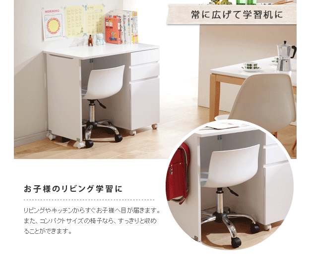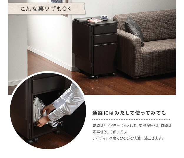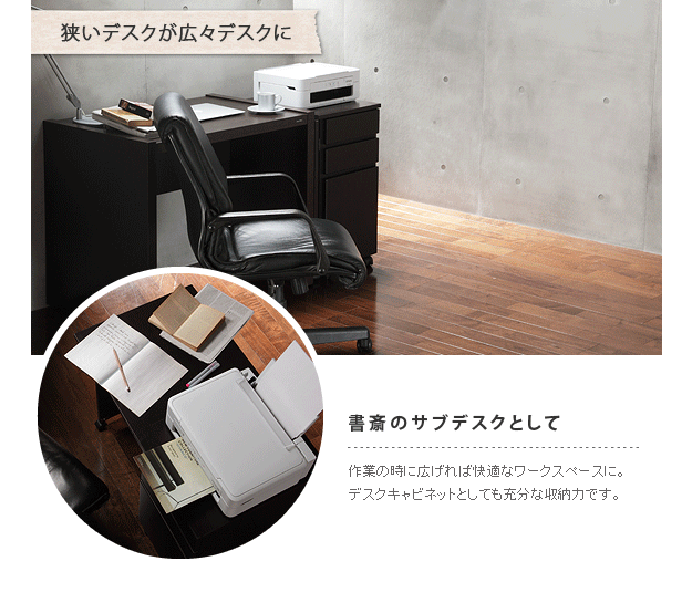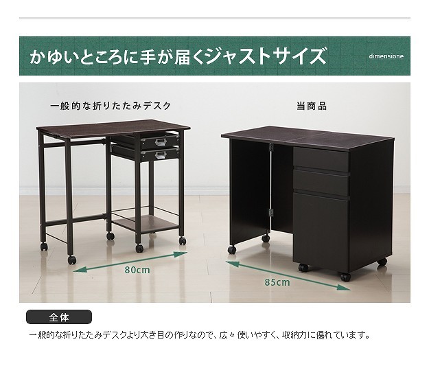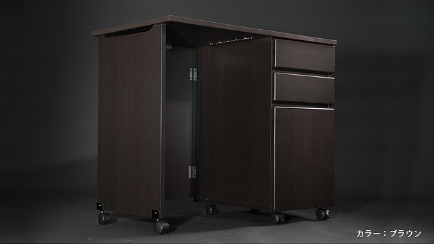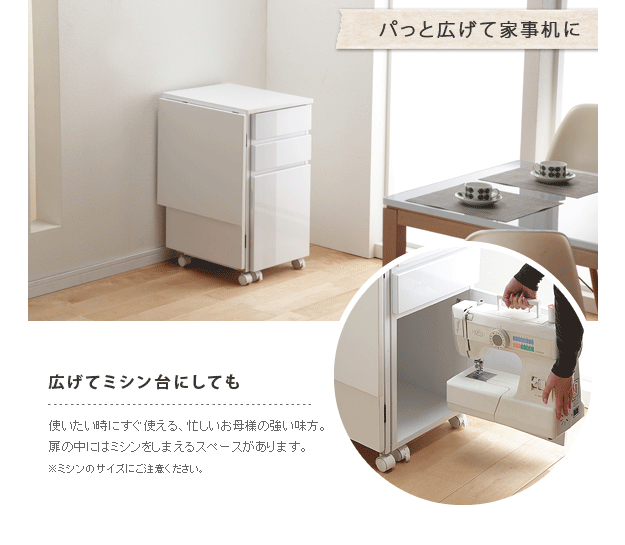 商品について:キャスター付きのコンパクトな折りたたみ便利デスクです。使いたい時はパッと広げて作業スペースに♪お部屋に馴染むシンプルデザインです。サイドチェストとしても使える収納力も魅力☆A4ファイルが入る引き出しと、小型ミシンもしまえる扉式収納がついています。
