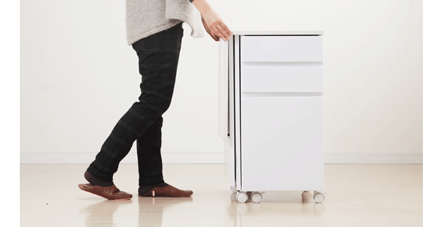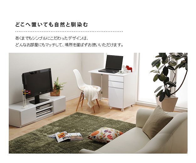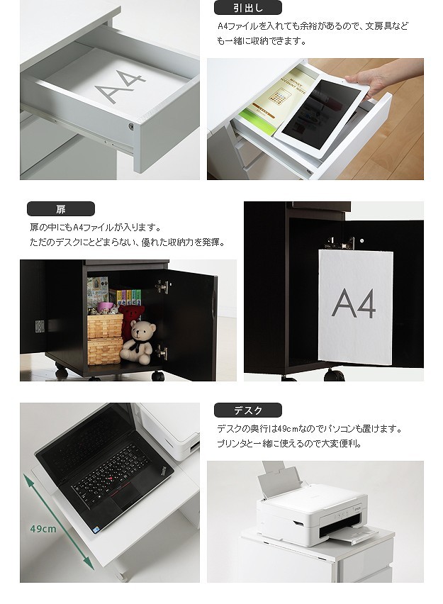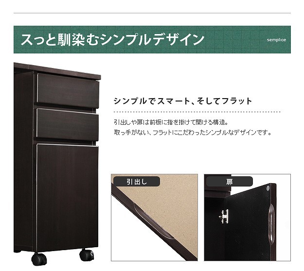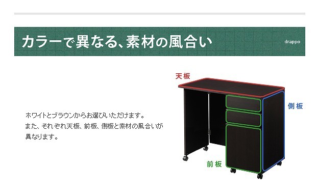 材質:天板・側板-プリント紙化粧繊維板、引出前板-PVCシート張り(※ホワイトは鏡面風仕上)、キャスター-ナイロン樹脂
