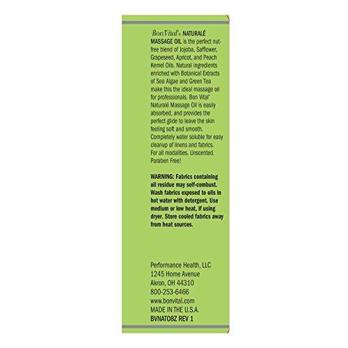 Studio : TheraBand Publisher : TheraBand Binding : Misc. Product Description Bon Vital´ Naturale Massage Oil - is the perfect nut free blend of Jojoba, Safflower, Grapeseed, Apricot, and Peach Kernel Oils. All natural ingredients enriched with Botanical Extracts of Sea Algae and Green Tea make this the ideal massage oil for professionals. Bon Vital´ Naturale Massage Oil is easily absorbed, and provides the perfect glide to leave the skin feeling soft and smooth. Completely water soluble for easy cleanup of linens and fabrics. For All Modalities. 0