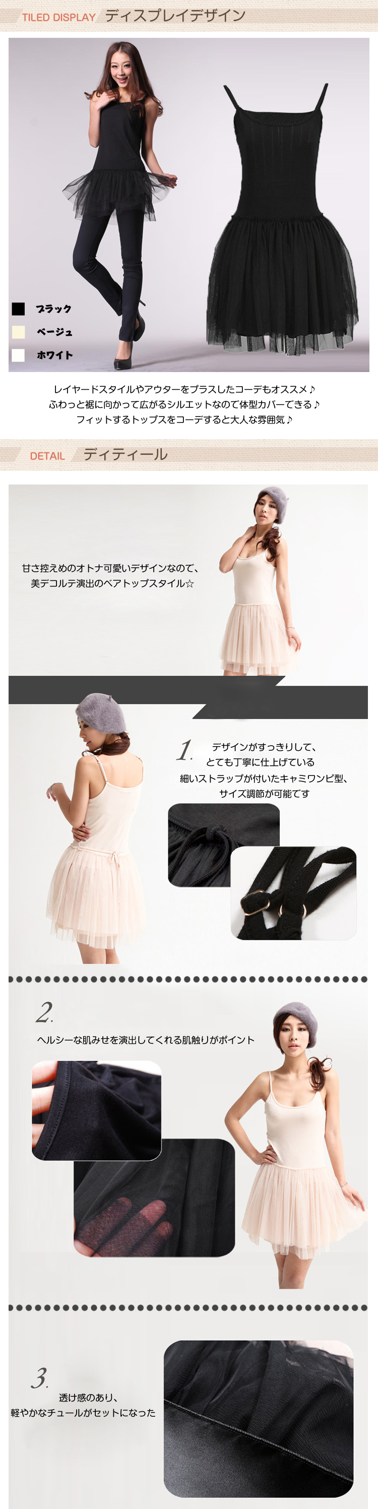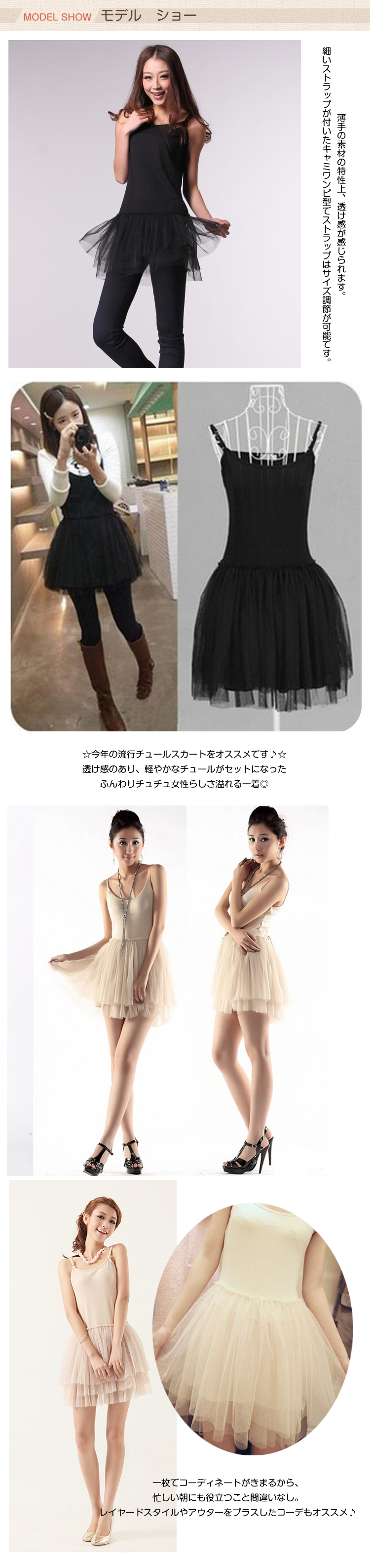 | ☆今年の流行チュールスカートをオススメです?☆透け感のあり、軽やかなチュールがセットになったふんわりチュチュ女性らしさ溢れる一着◎薄手の素材の特性上、透け感が感じられます。細いストラップが付いたキャミワンピ型でストラップはサイズ調節が可能です。一枚でコーディネートがきまるから、忙しい朝にも役立つこと間違いなし。レイヤードスタイルやアウターをプラスしたコーデもオススメ?ふわっと裾に向かって広がるシルエットなので体型カバーできる?フィットするトップスをコーデすると大人な雰囲気?甘さ控えめのオトナ可愛いデザインなので、美デコルテ演出のベアトップスタイル☆ | |