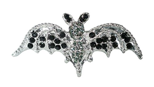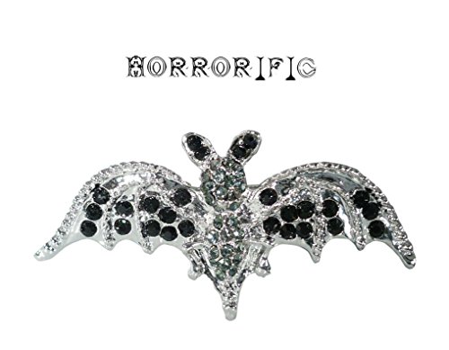 -. Binding : Jewelry -. Brand : Horrorific -. Color : Black -. Department : womens -. Feature : White metal with gray and black rhinestones / Pin back with safety C catch / Bold and daring / About 2 1/4 inches across and 1 1/8 inches long / Made in China -. Label : Horrorific -. Manufacturer : Horrorific -. Model : 59 -. MPN : 59 -. PartNumber : 59 -. ProductGroup : Jewelry -. ProductTypeName : FASHIONOTHER -. Publisher : Horrorific -. Studio : Horrorific -. Title : Horrorific Halloween Rhinestone Black Silvery Bat Pin Brooch 59