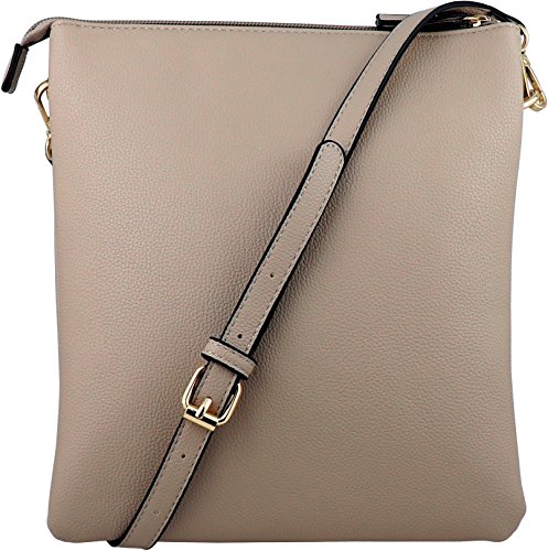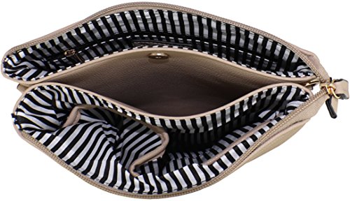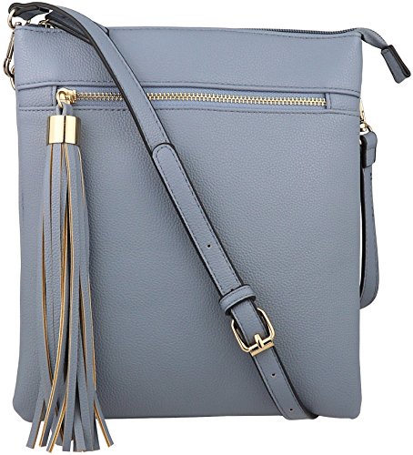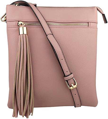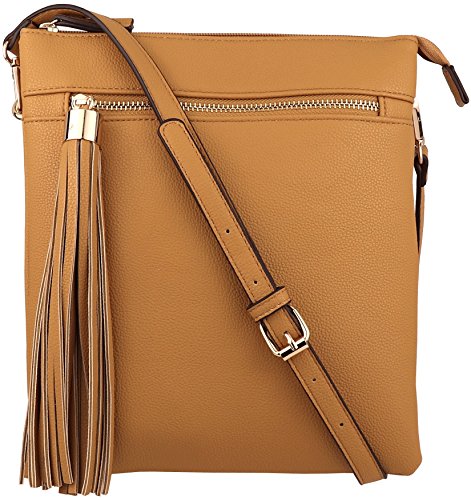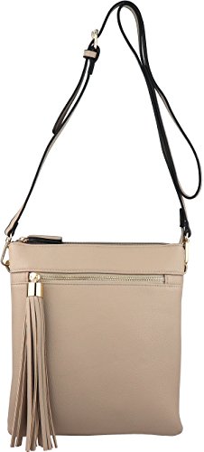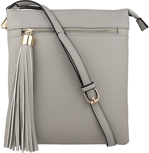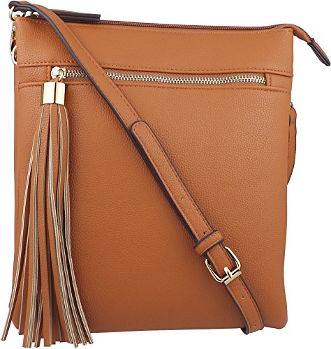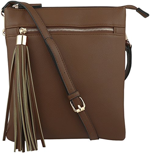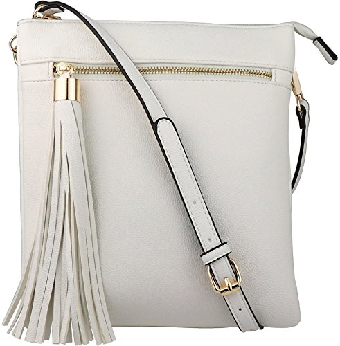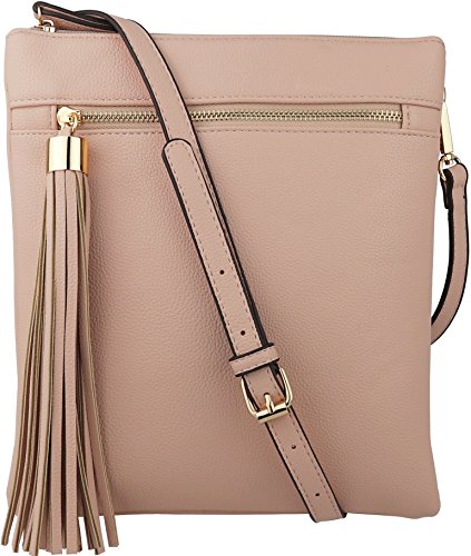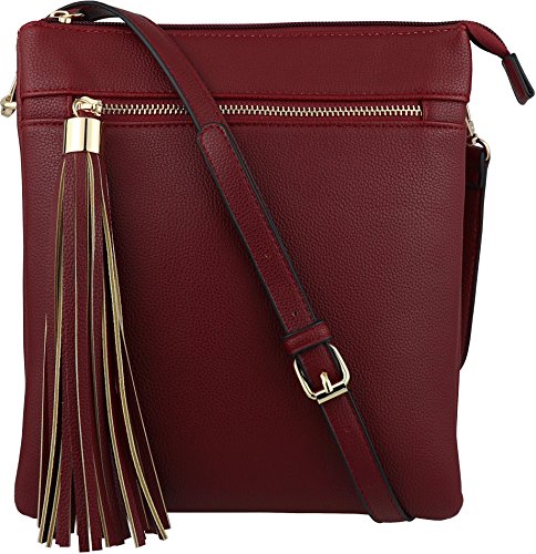 Fashion crossbody handbag that is made with faux leather with a black and white striped fabric lining. The purse is lightweight and incredibly comfortable to use on an everyday basis. It has a zipper closure at the top and a zipper pocket with a tassel accent on the front. Once the top zipper is opened, there are three smaller compartments inside of the purse with interior pockets. The middle compartment contains a magnetic clasp.