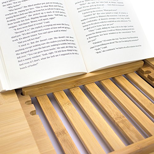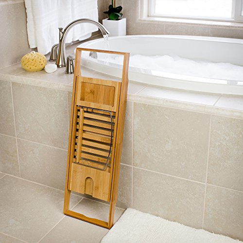 BELLASENTIALS BAMBOO BATHTUB CADDY WITH EXTENDING SIDES AND ADJUSTABLE BOOK HOLDER FOR A CUSTOMIZED FIT, PERFECT FOR ALL TUBS