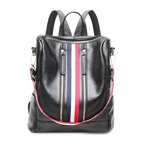 -. Brand : Fiswiss -. Color : Black With Blue Stripe -. Department : womens -. Feature : Full grain cow leather. Fabric lining / Five pockets in the interior, two are zippered / Adjustable double shoulder straps / 12.8'' (L) X 4.7'' (W) X 11'' (H) / Since leather material is very soft, some wrinkles may on the surface of the handbag, that is not quality problem. -. ProductGroup : Shoes -. ProductTypeName : HANDBAG -. Size : Medium -. Title : Fiswiss Women's Genuine Leather Casual Backpack Everyday Backpack Purses And Handbags