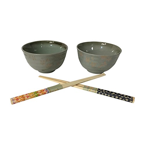 Fuji Asian Floral Blossom Rice Bowls and Bamboo Chopsticks - Set of 2 (Light Green)