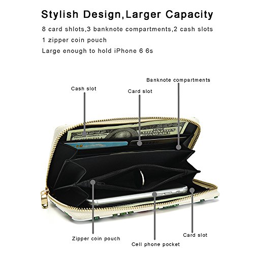 Spacious Interior :6 credit card slots, 1 zipper coin pocket, 4 cash compartment , enough hold iphone,It can easily hold your business cards, ID cards, keys,cash,notebooks, etc