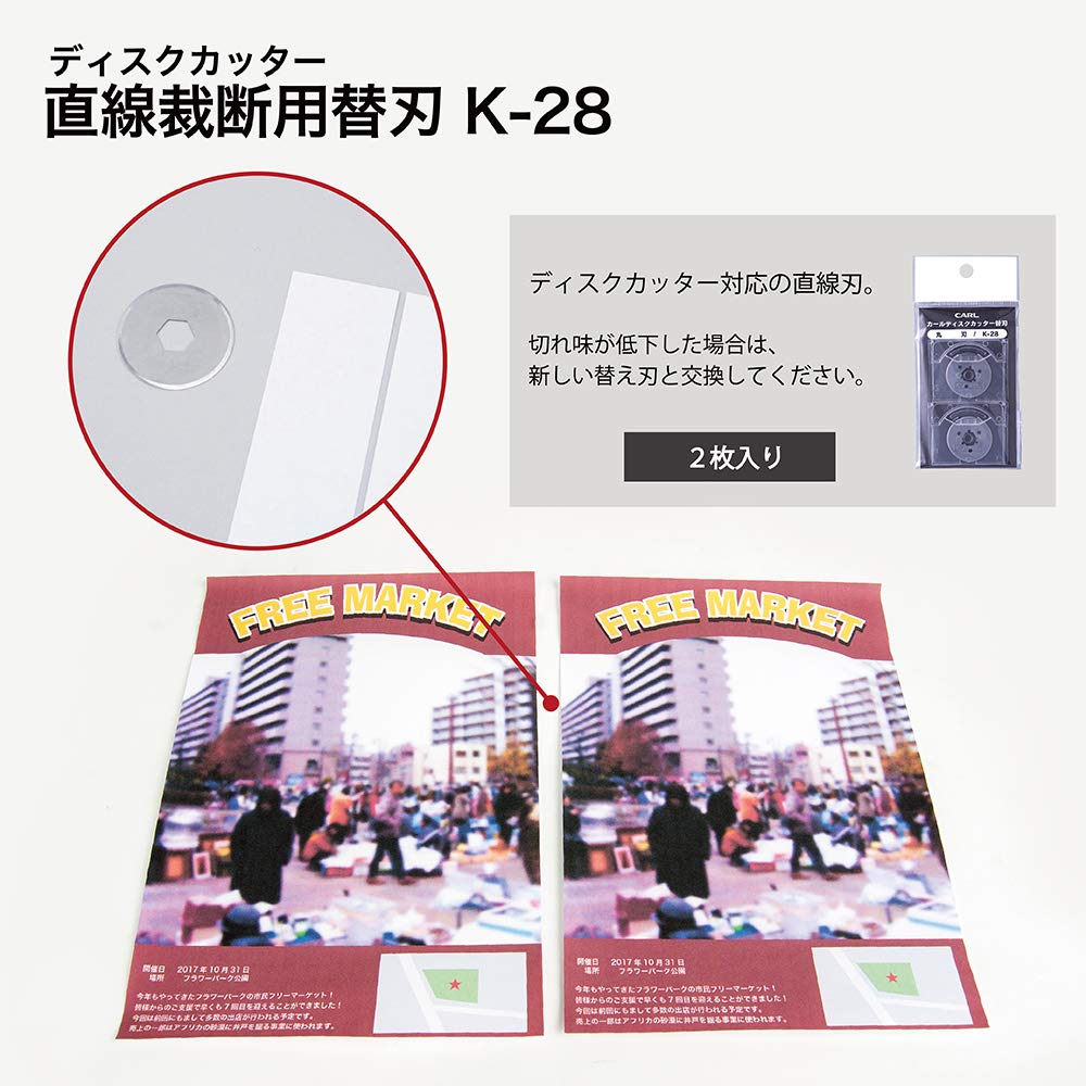 スライド式裁断機「ディスクカッター」の替刃です。 紙を直線に裁断できます。 切れ味が低下した場合は、新しい替刃と交換して下さい。 【本体材質】 鋼材(SK) 【本体サイズ】φ28×H0.3mm 【本体重量】1.5g
