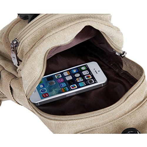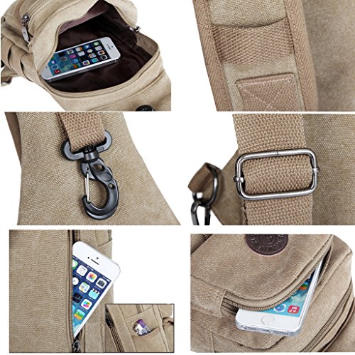 Vintage Canvas bag with multiple pockets.Consists of one zippered main bag, one zippered pockets and one flap pocket to safely store and organize your cellphone, tablet, wallet, keys, ID card, credit card, small snacks, and a mini safe zipper pocket on the back for your other small personal belongings.Adjustable padded shoulder straps for carrying comfort.