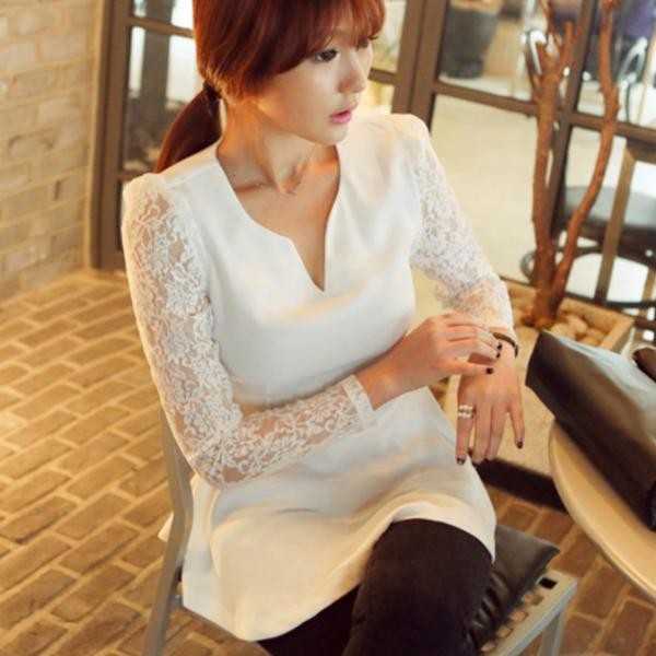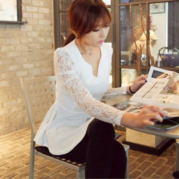 きれいめVネック レース長袖 シフォン ぺプラムトップス ホワイト