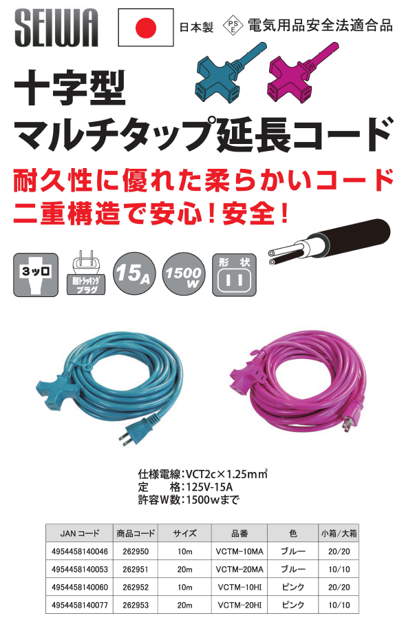 耐トラッキングプラグ使用の十字型マルチタップ(3ッ口)延長コード10m。電気用品安全法適合品