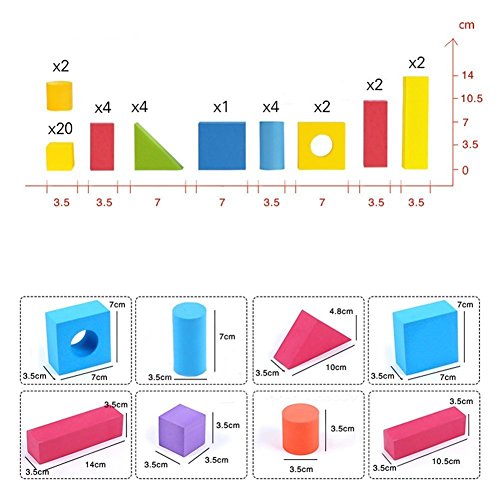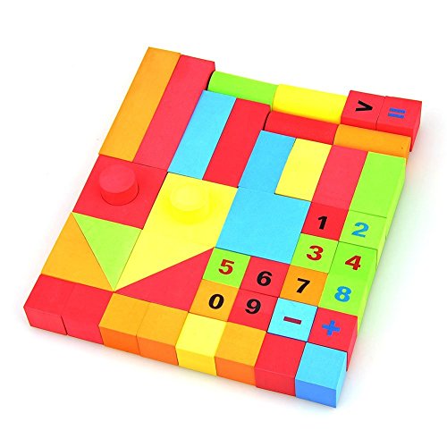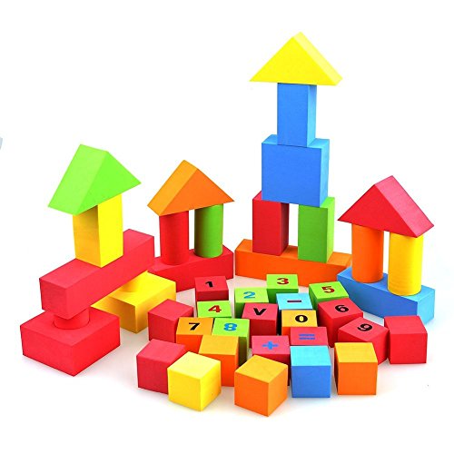 -. Feature : This is an intelligent and fun foam building blocks set ,suitable for kids more than 3 years old / Using waterproof and soft foam material ,which can be reused after by washing it ,so this is a very economic ?practical and environmental toy ;The soft texture of the blocks is designed for children with sensitive skin and their safety as children tend to toss their toys compare to traditional wooden or plastic blocks. / Each foam block has different color and shape,which can develop children's creativity and sensory learning through shape, color / 10 blocks P.R.Inted with arabic numerals from "0-9" , and 4 blocks with mathematical symbol " +?-?=?>" ,which can inspire kids counting recognition while improving their motor skills and hand-eye coordination. / Kids can use this puzzle kits to build many modes ,like house ,walls ,bridge,bus,castle,chair, bed, dogs厖ect,which can provide kids much entertainment while thinking