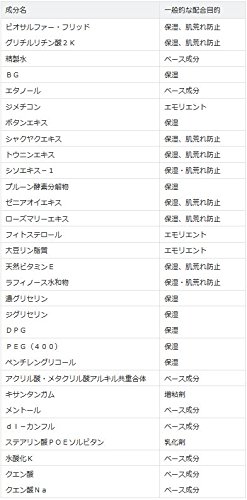 ビオサルファー・フリッド、グリチルリチン酸2K、精製水、BG、エタノール、ジメチコン、ボタンエキス、シャクヤクエキス、トウニンエキス、シソエキス-1、プルーン酵素分解物、ゼニアオイエキス、ローズマリーエキス、フィトステロール、大豆リン脂質、天然ビタミンE、ラフィノース水和物、濃グリセリン、ジグリセリン、DPG、PEG(400)、ペンチレングリコール、アクリル酸・メタクリル酸アルキル共重合体、キサンタンガム、メントール、dl-カンフル、ステアリン酸POEソルビタン、水酸化K、クエン酸、クエン酸Na