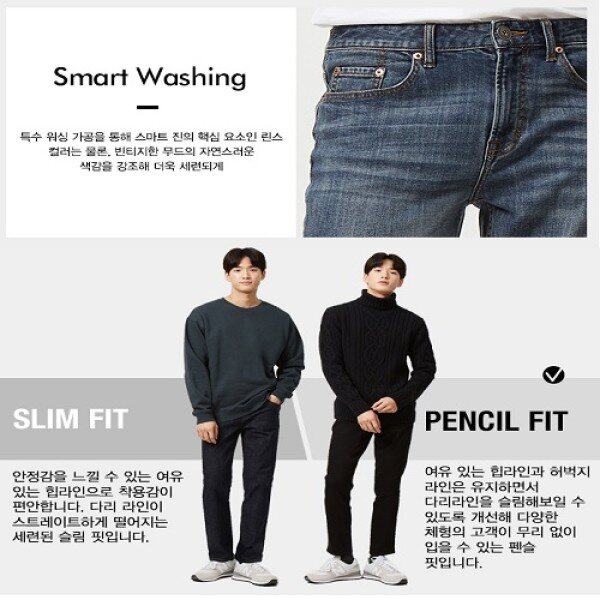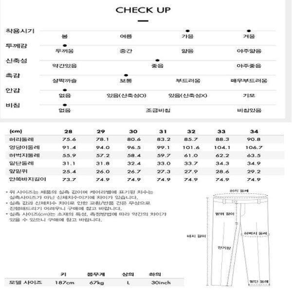 안정감을 느낄수 있는 여유있는 힙라인으로 착용감이 편합니다 .다리라인이 스트레이트하게 떨어지는 세련된 슬림핏 입니다.