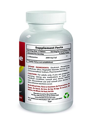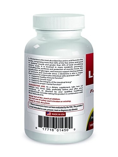 -. Binding : Health and Beauty -. Brand : Best Naturals -. EAN : 0817716014500 -. Feature : Supports Immune Function -- Supports Muscle Mass / Important sports-related nutrient -- supports a healthy nervous system / Amino Acid Supplement -- a nutrient that is essential for wound healing / L-Glutamine 1000 mg Tablet -- 180 Tablets per Bottle / All Best Naturals products are manufactured in accordance with Good Manufacturing Practices (GMP), among the highest standards in the world -- Proudly Made in USA -- Purity & Potency Guaranteed -. IsAdultProduct : 0 -. Label : Best Naturals -. Manufacturer : Best Naturals -. Model : No Model -. MPN : 817716014500 -. PackageQuantity : 1 -. PartNumber : 817716014500 -. ProductGroup : Health and Beauty -. ProductTypeName : HEALTH_PERSONAL_CARE -. Publisher : Best Naturals -. Studio : Best Naturals -. Title : Best Naturals L-Glutamine 1000 mg 180 Tablets -. UPC : 817716014500