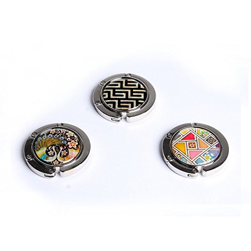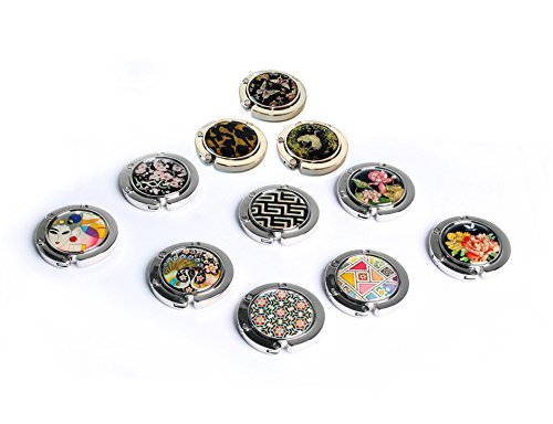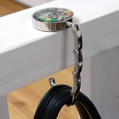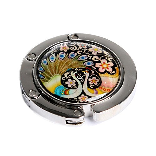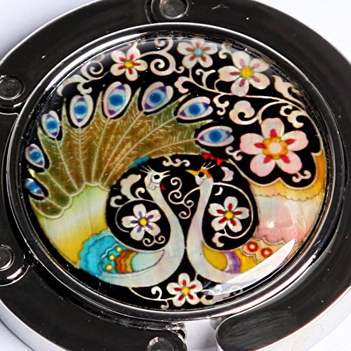 Product Description This stylish foldable purse hook with magnetic closure is elegantly embellished with the mother of pearl design of a pair of peacocks. This purse hook offers a pleasant way to hang your purse off the floor from tables and other surfaces in any public places. You can always keep your bag clean, close and safe with this purse hook. The elaborate adornment with the iridescence of mother of pearl designs makes it an impressive item for collection. It comes with a nice paper gift box. 0