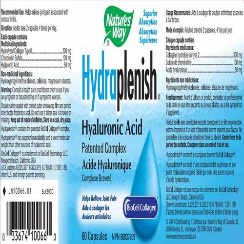 -. Binding : Misc. -. Brand : Nature's Way -. Feature : 2 Bottles of 60 Vcaps / Hydraplenish contains the patented BioCell Collagen II complex for healthy connective tissue and synovial fluid / Nature's Way -. Label : Nature's Way -. Manufacturer : Nature's Way -. ProductGroup : Health and Beauty -. ProductTypeName : BEAUTY -. Publisher : Nature's Way -. Studio : Nature's Way -. Title : Nature's Way Hydraplenish, 60 Vcaps