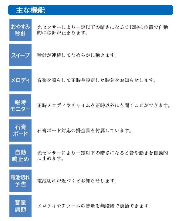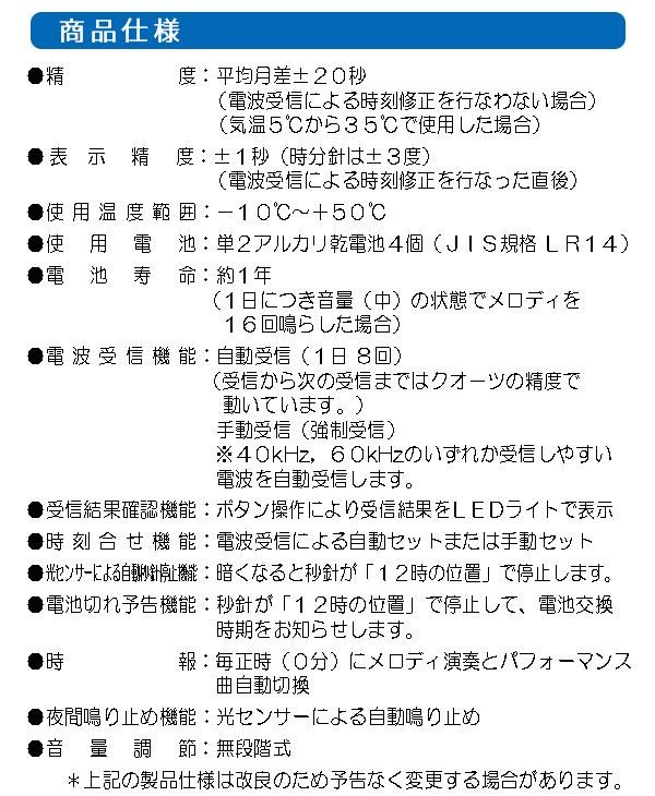 | 付属品 | 単2アルカリ乾電池×4個、木ねじ(木の厚い壁・木の柱専用)×1本、石膏ボードの壁用掛け具(掛金具×1個・釘×5本)、取扱説明書、保証書(保証期間:1年間) |