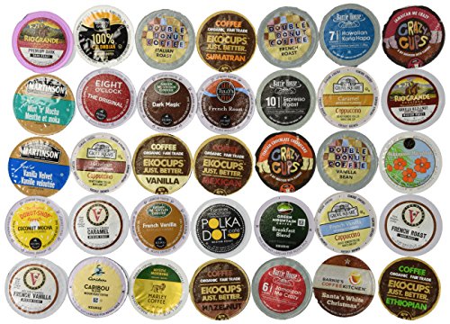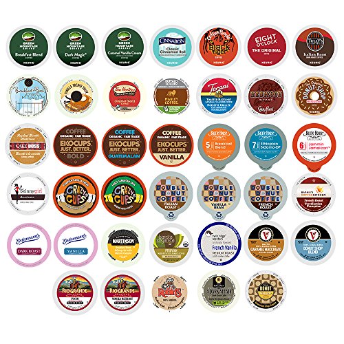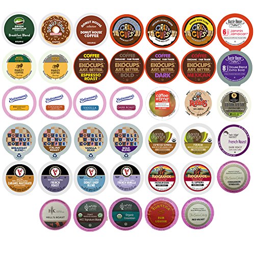 Contains: 1 Barnie's Coffee Kitchen Barnie's Blend Coffee 1 Barrie House Colombia Reserve Coffee 1 Barrie House Espresso roast Coffee 1 Brown Gold 100% Brazilian Coffee 1 Caribou Coffee Caribou Blend Coffee 1 Caza Trail Coastal Blend Coffee 1 Caza Trail Kona Blend Coffee 1 Crazy Cups Sumatran Tiger Coffee 1 Diedrich French Roast Coffee 1 EkoCups Bold Coffee 1 Ekocups Guatemalan Coffee 1 Green Mountain Breakfast Blend Coffee 1 Green Mountain Dark Magic Coffee 1 Marley Buffalo Soldier Coffee 1 Martinsons House Blend Coffee 1 Rio Grande Roasters Mesa Sunrise Coffee 1 Rio Grande Roasters Premium Dark Coffee 1 second Cup Regular Coffee 1 Tim Horton's Regular Coffee 1 Victor Allen's Coffee Donut Shop Coffee 1 Tully's Italian Roast Coffee 1 Authentic Donut Shop Vanilla Coffee 1 Barrie House Irish Cream Coffee 1 Cake Boss Dulce De Leche Coffee 1 Caza Trail Caza Trail French Vanilla Coffee 1 Victor Allen's Coffee French Vanilla Coffee 1 Copper Moon Caramel Cappuccino Coffee 1 Crazy Cups Italian chocolate Coffee 1 Crazy Cups Jamaican Me Crazy Coffee 1 Donut House Collection Donut Cinnamon Roll Coffee 1 Ekocups Vanilla Coffee 1 Green Mountain French Vanilla Coffee 1 Grove Square Caramel Cappuccino Coffee 1 Grove Square French Vanilla Cappuccino Coffee 1 Guy Fieri Caramel Apple Bread Pudding Coffee 1 Hurricane Coconut Fudge Typhoon Coffee 1 Indulgio Hazelnut Cappuccino Coffee 1 Martinsons Vanilla Velvet Coffee 1 Rio Grande Roasters Vanilla Hazelnut Coffee 1 Victor's Allen Coffee Hazelnut CoffeeFeature