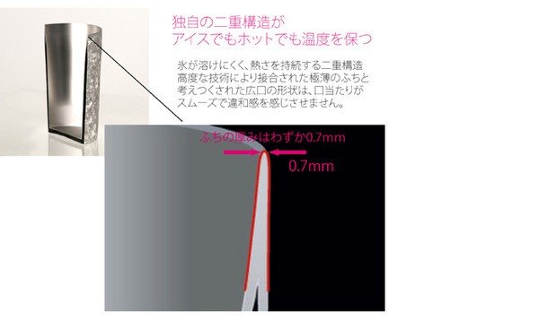 【こだわり抜いた縁】一般的な溶接技術では考えられないほどスマートに接合されたフチ。違和感を感じさせないスムーズな口当たりで飲み物の美味しさをダイレクトに楽しむことができます。