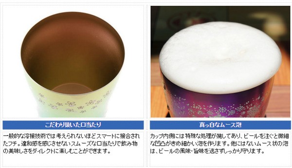 カップ内側には特殊な処理が施してあり、ビールを注ぐと微細な凹凸がきめ細かい泡を作ります。他にはないムース状の泡は、ビールの風味・旨味を逃さずしっかり守ります。