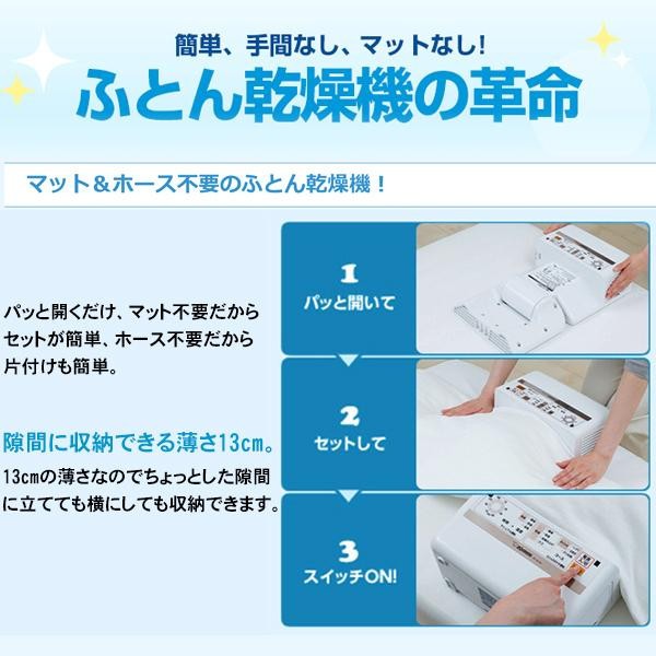 | 簡単、手間なし、マットなし!!ふとん乾燥機の革命!! |