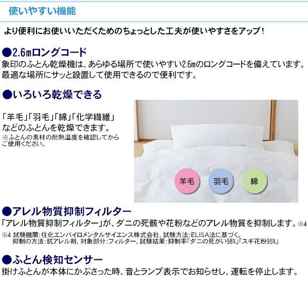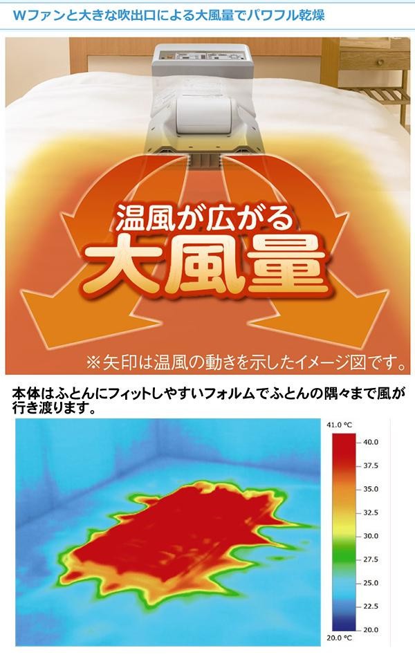 | 仕様 | 電源:交流100V・50/60Hz 消費電力(50/60Hz):655/645W コード長:2.6m 運転音:約46dB(ふとん乾燥時) タイマー:15・30・45・60・75・90・120・180分 安全装置:電流ヒューズ・温度ヒューズ |
