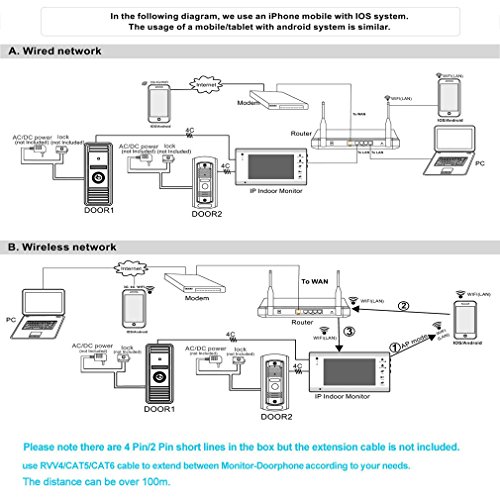 Note:Wifi video door phone does not mean u do not need wire cables,Wireless Indoor LCD Monitor and doorbell is Wired Outdoor Camera,pls relate to the picture.