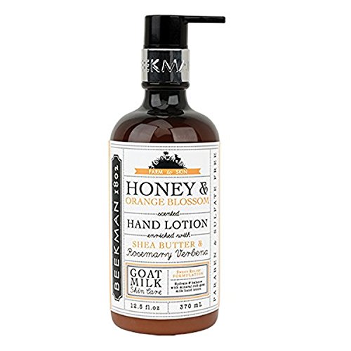 - Beekman 1802 Pure Goat Milk Hand Lotion in "Honey & Orange Blossom" fragrance. 12.5 ounce bottle.