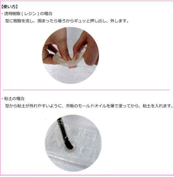 粘土や透明感のあるレジンクラフトにも楽しめる、繰り返し使えるやわらかい型です。紫外線を通す透明なモールドなのでUVレジンがきれいに固まります。また、気泡や粘土の浮きがひと目でわかって便利です。 |