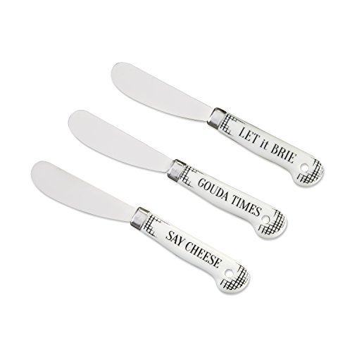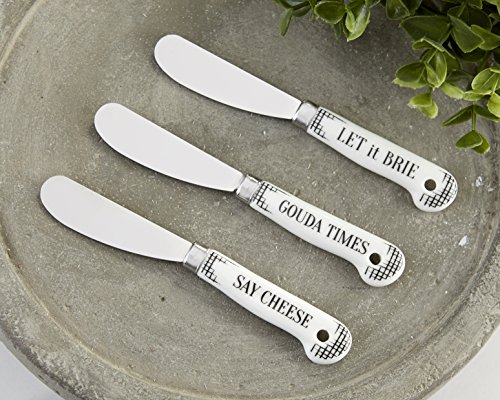 Silver metal blade with matte white ceramic handle with print. There are 3 spreaders each with a different text: "let it Brie", "Gouda time" and "say cheese".