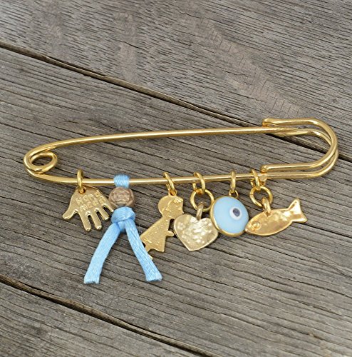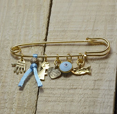This safety pin is about 2.5" decorated with protection charms and is meant to protect a new baby by pinning it to the outside of the baby stroller or crib. The brooch is decorated with Blue string and gold plated charms include the Evil Eye Protection glass eye charm, Hamsa Hand for protection, Heart charm and Baby Boy. The brooch pin features the Hamsa Hand - an open right hand, that is used as a sign of protection in many cultures throughout history, the Hamsa is believed to provide defense against the evil eye. Handmade by MIZZE Jewelry and ships from within the UK. We stand behind our brand and provide a 100% full money back guarantee. If you are unhappy with your Baby Boy Pin, for any reason please contact us!Feature