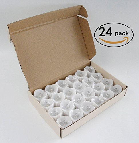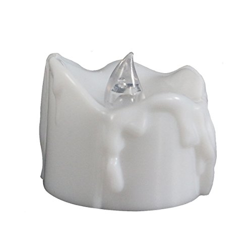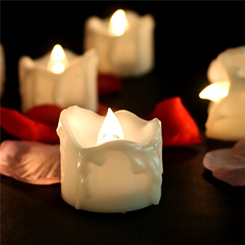 - Set of 24 LED wax dripped warm white flickering flameless candles, battery operated.