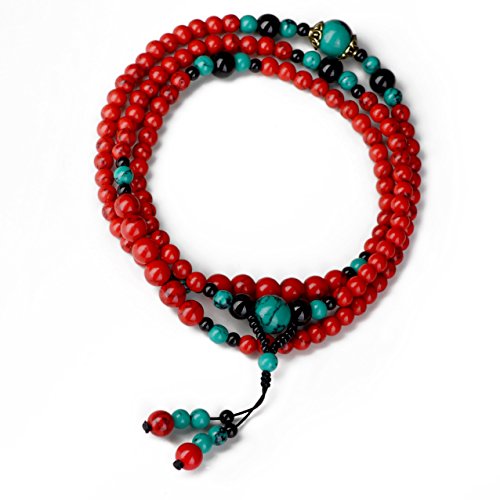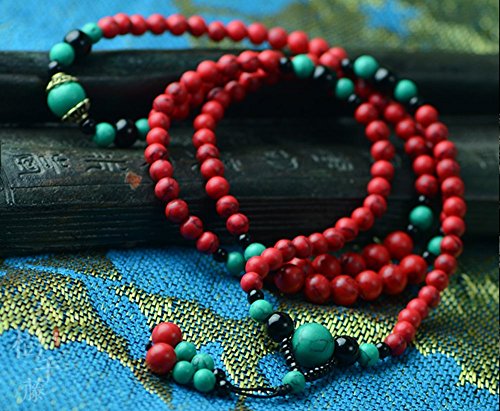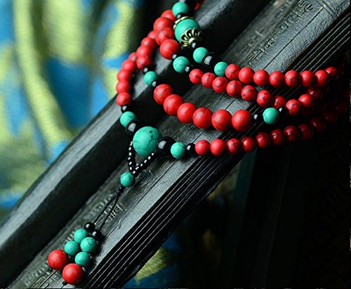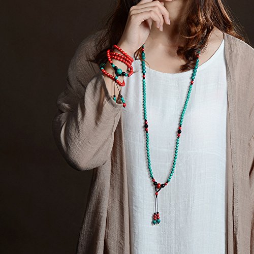 FYF Handmade Women Choker Necklace Ground Buddha Beads Bracelet Turquoise Pendant Long Necklace Green And Red (Red)