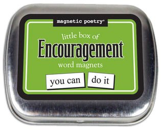 -. Binding : Misc. Supplies -. Brand : Magnetic Poetry -. Color : Green -. EAN : 0602394037008 -. Feature : A cute little tin filled with encouraging words. / As a gift, a small act of kindness that won't be forgotten. / Contains 72 themed magnetic word tiles. / Packaged in a shrink-wrapped tin container. / Made in USA -. Label : Magnetic Poetry -. Manufacturer : Magnetic Poetry -. MPN : 3700 -. PackageQuantity : 1 -. PartNumber : 3700 -. ProductGroup : Toy -. ProductTypeName : TOYS_AND_GAMES -. Publisher : Magnetic Poetry -. Size : 1.75" x 2.25" x 5" -. Studio : Magnetic Poetry -. Title : Magnetic Poetry - Little Box of Encouragement - Words for Refrigerator - Write Ps and Letters on the Fridge -. UPC : 602394037008