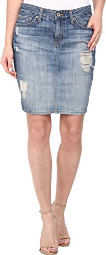 The Kara Skirt features a mid rise and pencil silhouette with a split back hem. Lennox is a light blue wash with 3-D whiskers, partially backed rips, and heavy sanding that calls out the slub character of the rigid denim. Aged logo hardware. Contrast topstitching. Signature 'Omega' design stitched at the back pockets. Leather brand patch accents the back waist. Five-pocket design. Belt loop waistband. Zipper fly and button closure. 92% cotton, 7% polyester, 1% elastane. Machine wash and tumble dry. Imported.