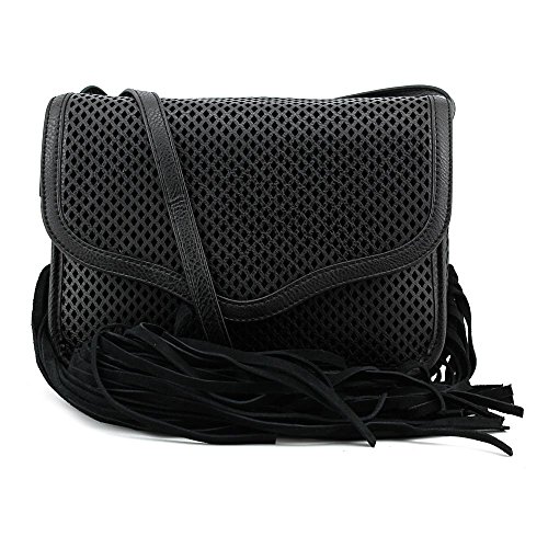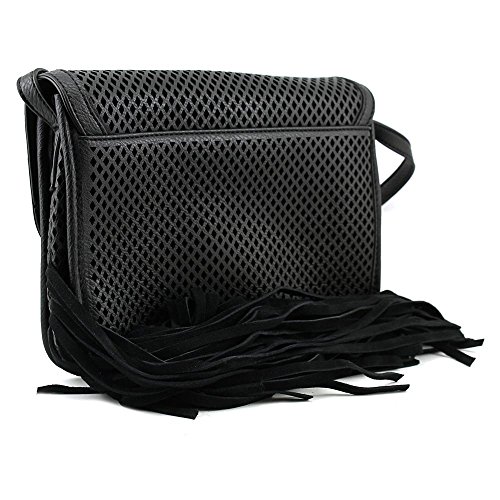 -. Feature : Mid-size cross-body bag with diamond-mesh overlay, piped edging, and fringe at bottom seam / Pockets: 1 interior zip, 1 interior slip