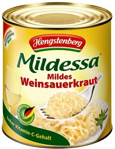 -. Feature : Hengstenberg Mildessa Mildes Sauerkraut in 28.6oz (800g) tin. Pre-cooked Sauerkraut with Bavarian Wine. Serve as a cold salad or heat by simmering in water or beef stock. Sauerkraut directly translated as Sour Cabbage, is finely shredded cabbage that has been fermented by various lactic acid bacteria, including Leuconostoc, Lactobacillus, and Pediococcus. Mildes Weinsauerkraut contains vitamin C, lactobacilli, and other nutrients. Serving for 6. Product of Germany.
